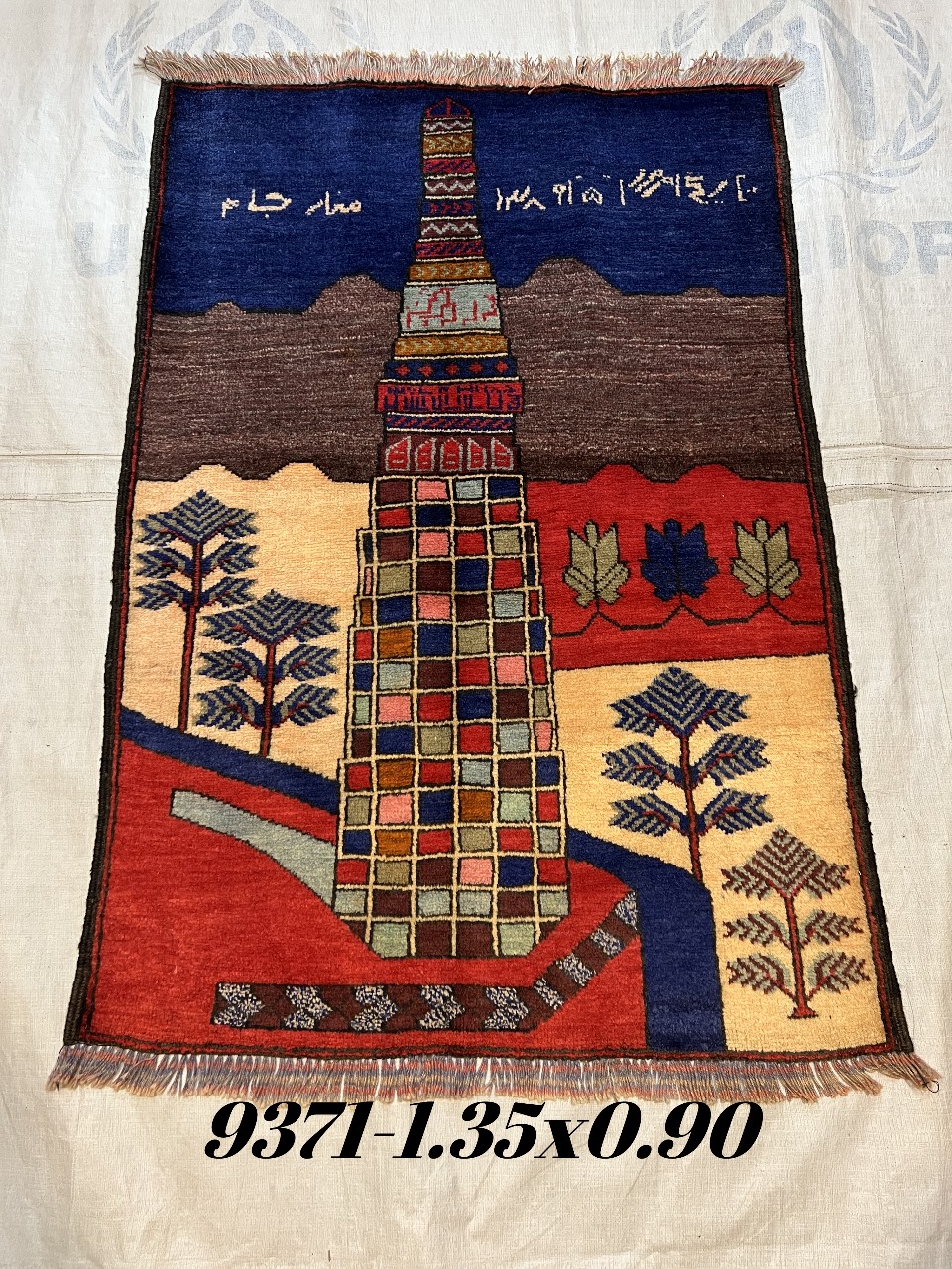 This hand-made Afghan war rug, measuring 135 cm x 90 cm, features a unique design that incorporates weapons, making it a conversation piece in any room. The rug is hand-knotted with 100% wool pile, ensuring durability and quality. With a modern style, regional Afghan design, and vibrant multicolor palette, this rug is suitable for various living spaces such as bedrooms, dining rooms, or hallways. This original piece from the 21st century is both washable and represented in a rectangular shape, ideal for those looking to add a touch of culture and history to their decor.