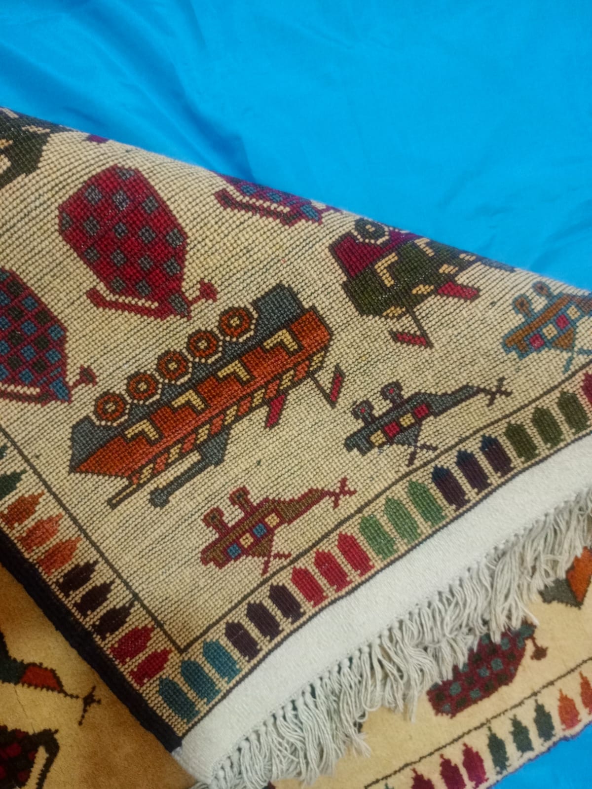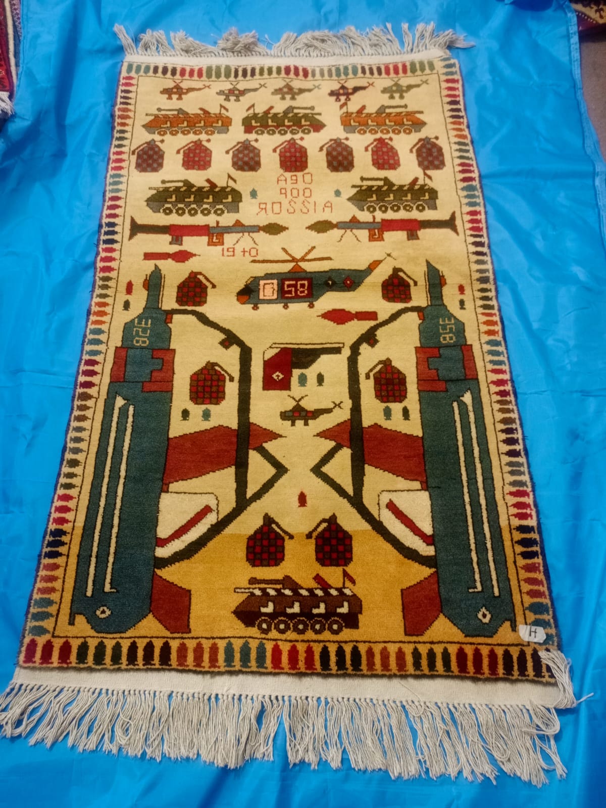This hand-made Afghan war rug, measuring 125cm x 87 cm, features a unique design that incorporates weapons, making it a conversation piece in any room. The rug is hand-knotted with 100% wool pile, ensuring durability and quality. With a modern style, regional Afghan design, and vibrant multicolor palette, this rug is suitable for various living spaces such as bedrooms, dining rooms, or hallways. This original piece from the 21st century is both washable and represented in a rectangular shape, ideal for those looking to add a touch of culture and history to their decor.