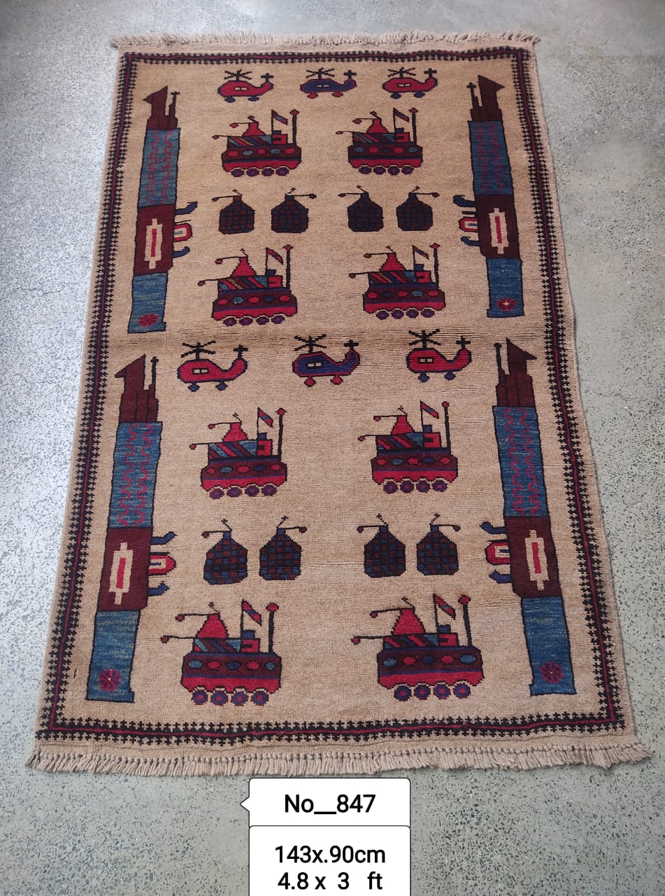 This hand-made Afghan war rug, measuring 143 cm x 90 cm, features a unique design that incorporates weapons, making it a conversation piece in any room. The rug is hand-knotted with 100% wool pile, ensuring durability and quality. With a modern style, regional Afghan design, and vibrant multicolor palette, this rug is suitable for various living spaces such as bedrooms, dining rooms, or hallways. This original piece from the 21st century is both washable and represented in a rectangular shape, ideal for those looking to add a touch of culture and history to their decor.